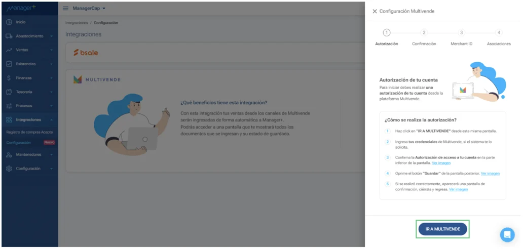 Se desplegará un menú lateral donde encontrarás las instrucciones para realizar la autorización de la cuenta, haz click en Ir a Multivende.