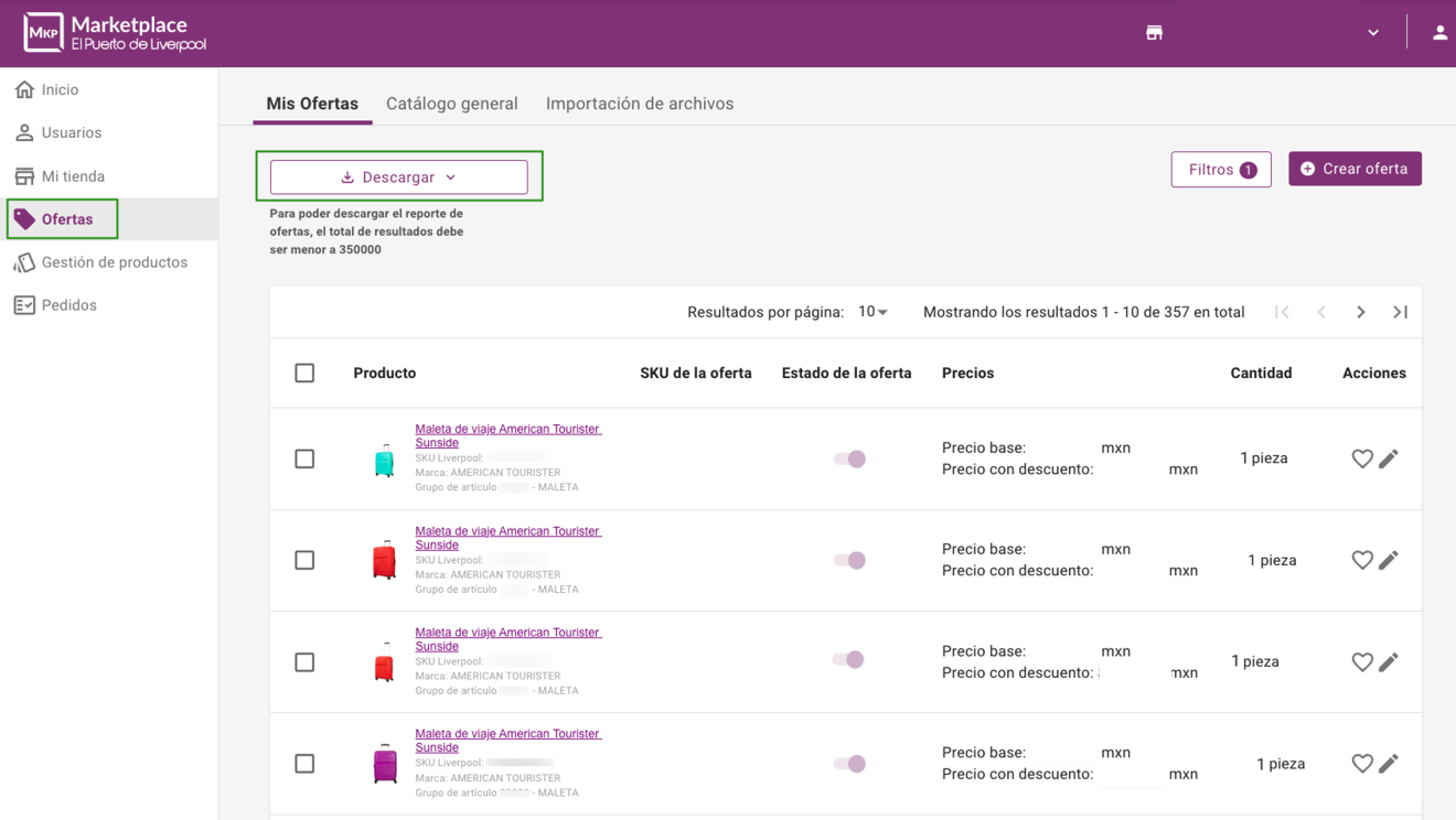 1. Ingresa a tu cuenta del Seller Center de Entrada Única de Liverpool y navega a Ofertas > Mis Ofertas.