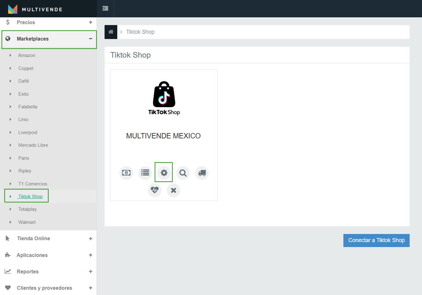 Para comenzar la conexión a TikTok Shop, en el menú de Multivende, navega a Marketplaces > TikTok Shop > Configuración (engranaje).