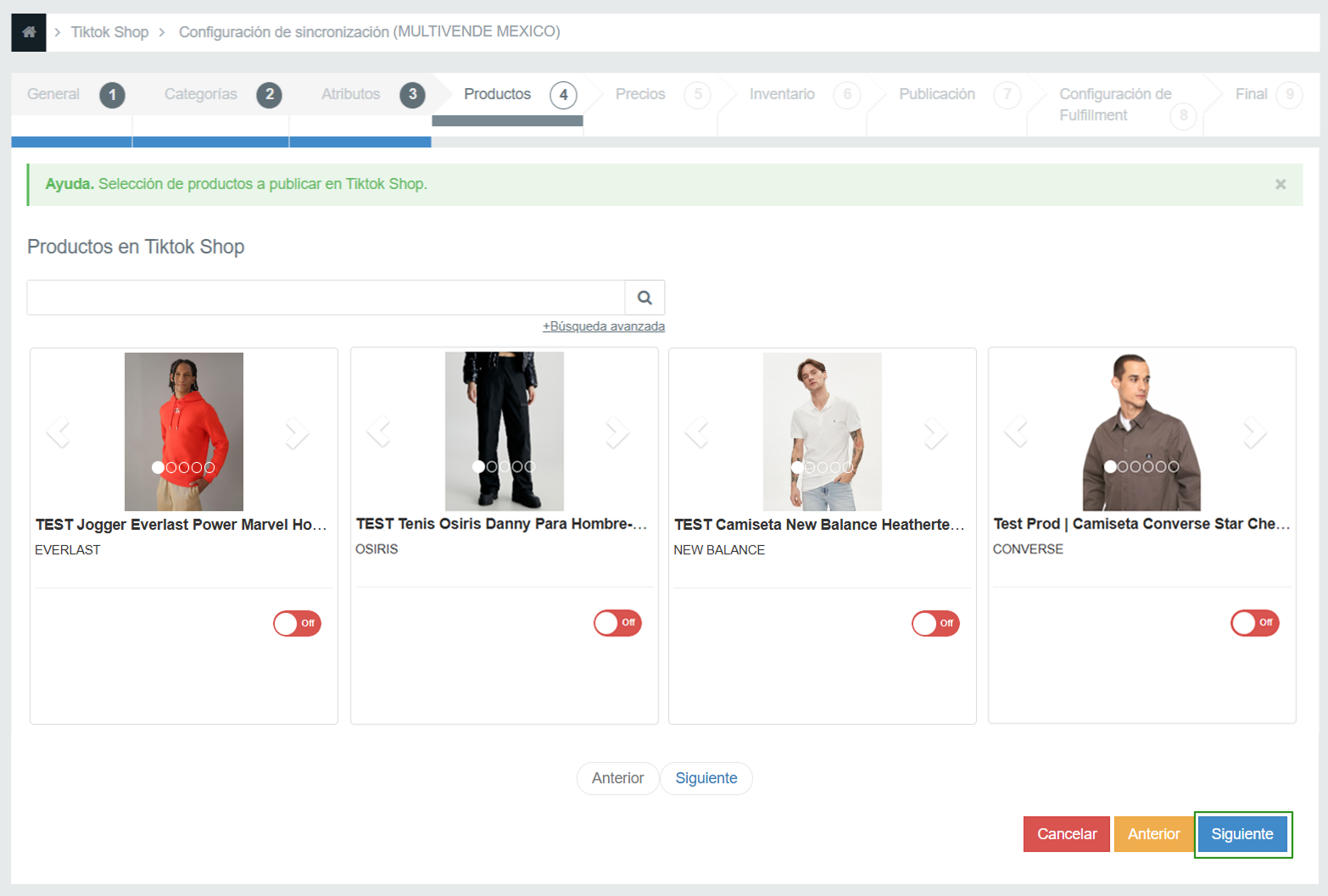 Mediante la sección de “Productos”, podrás activar y desactivar los productos que deseas vender en este Marketplace. Al finalizar de activar los artículos que deseas publicar, selecciona Siguiente.