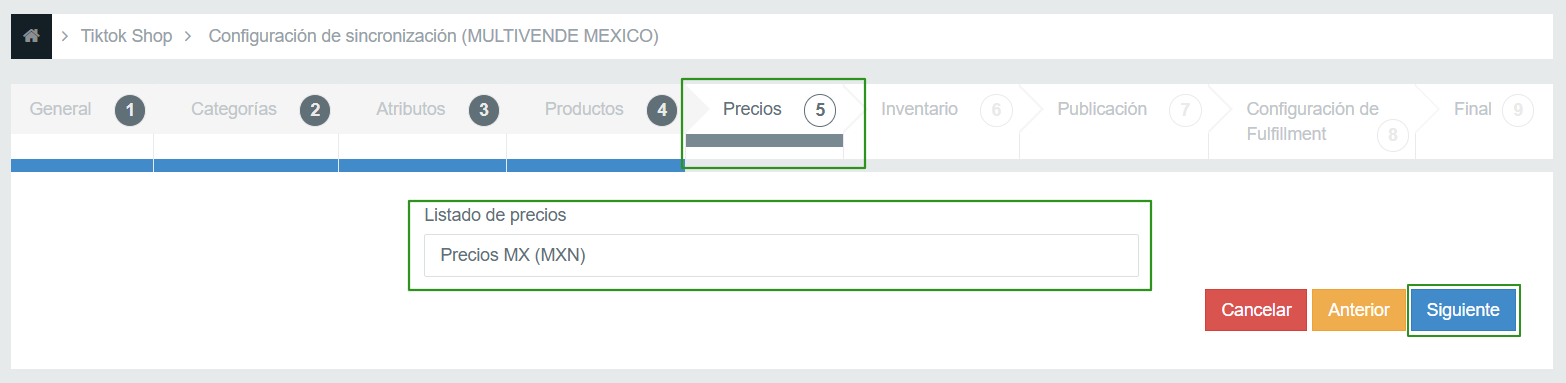 En la sección de “Precios”, elige la lista correspondiente para tus productos. Si operas en múltiples marketplaces, te recomendamos crear una lista distinta para cada uno, aunque los precios sean idénticos en todos los canales. Luego de seleccionar tu lista de precios, presiona Siguiente.
