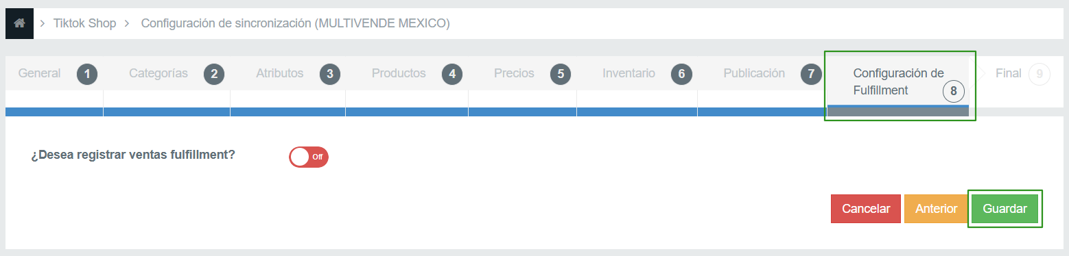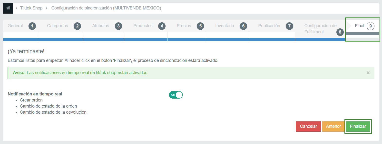 El último paso de la configuración su objetivo es guardar todas las configuraciones realizadas en los pasos anteriores y enviarlas al marketplace. Una vez llegado a este paso debes seleccionar en Finalizar para activar el proceso de sincronización.