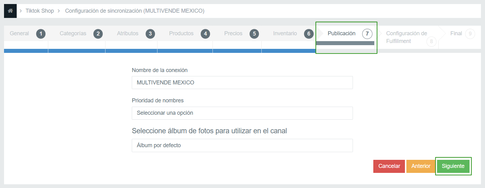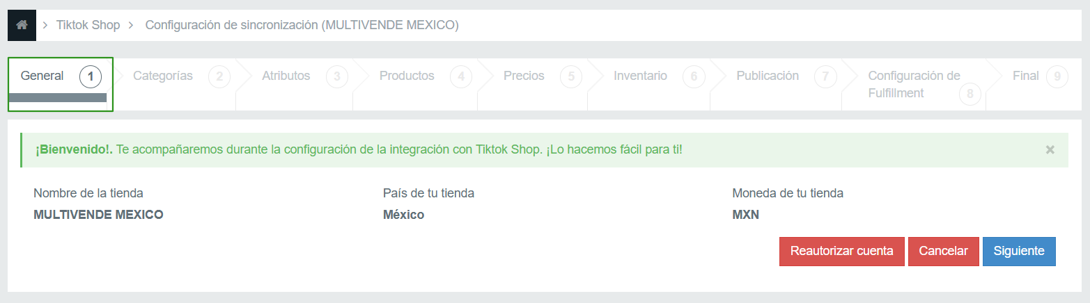 Una vez realizado la conexión con tu cuenta de TikTok Shop, estos son los pasos que debes seguir para realizar la configuración de la sincronización: