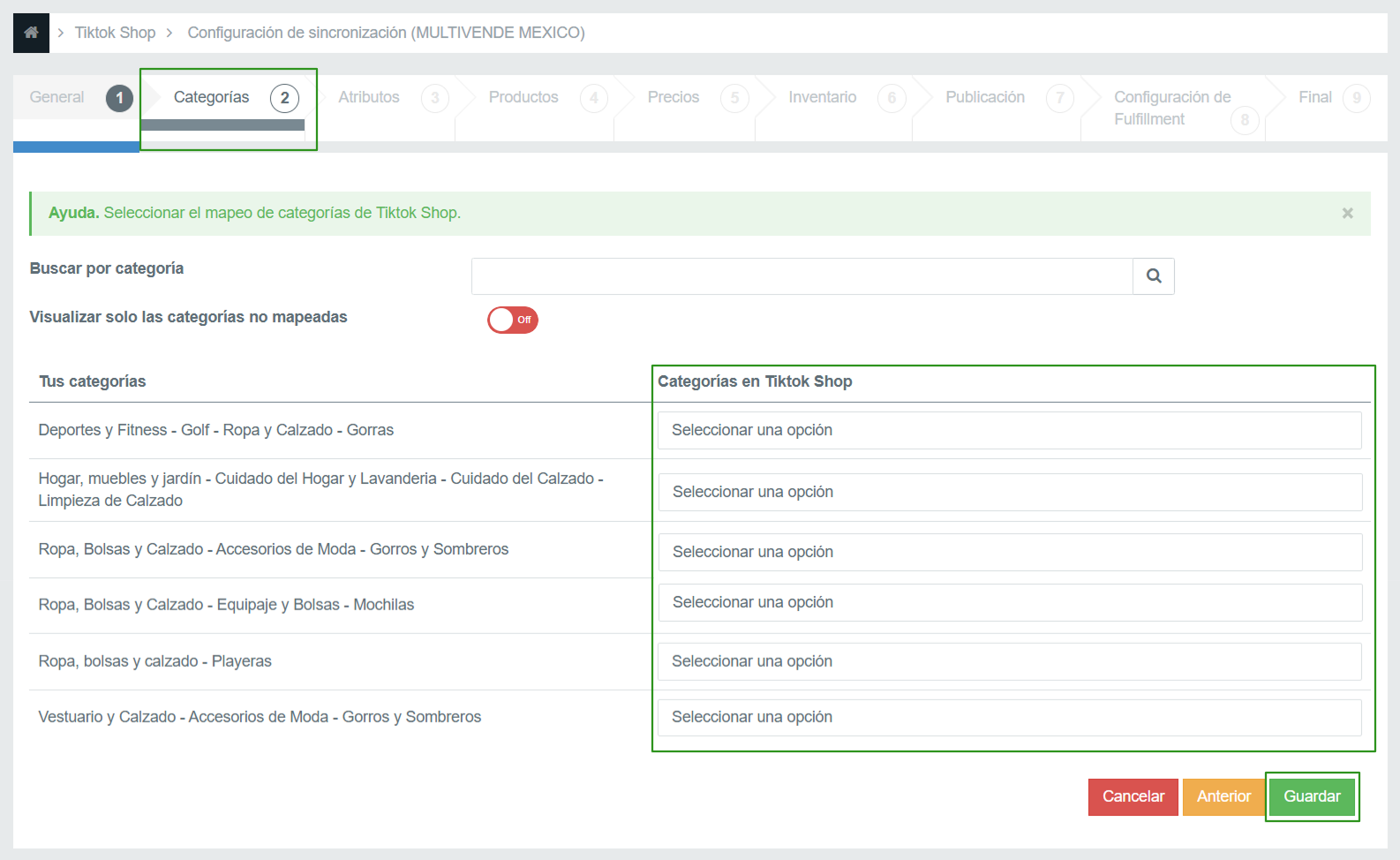 Paso 2. Mapeo de tus categorías de Multivende con las categorías de TikTok Shop.