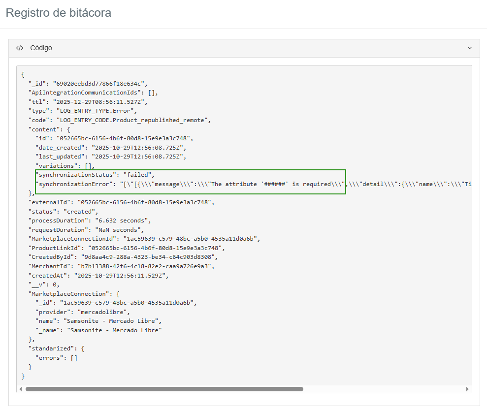 | Errores por valores incorrectos o incompletos | Attribute [####] to be added with values | Debido a que la categoría mapeada se necesita completar un atributo opcional solicitado por parte de Mercado Libre. | Valida que el atributo "Motivo de GTIN vacío" se encuentra mapeado en la configuración de la conexión de Mercado Libre. |
