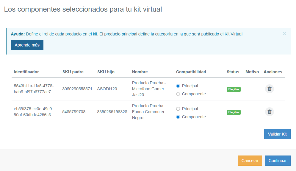 Haz clic en Validar kit para verificar si los productos seleccionados son elegibles.