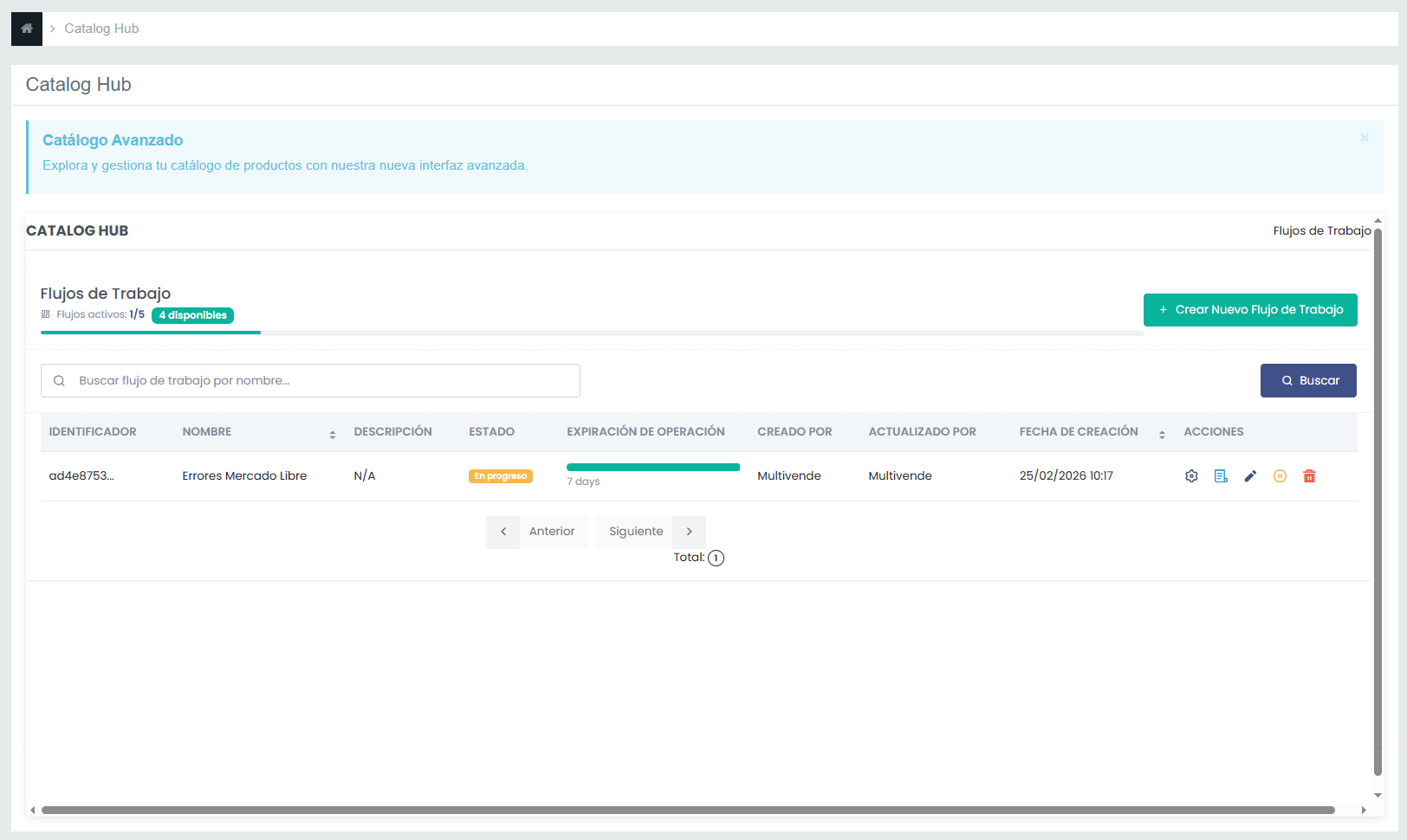 Desde el módulo de Catálogo Hub puedes ver todos tus flujos de trabajos en la sección Flujos de Trabajo. Allí encontrarás: