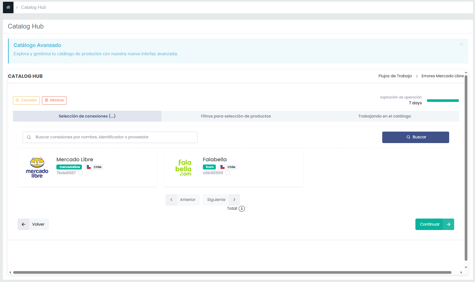 Selecciona la conexión o conexiones sobre las que quieres trabajar. Puedes buscarlas por nombre, identificador o proveedor.