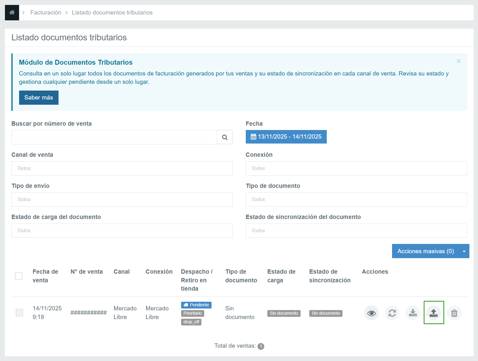 Esta herramienta centraliza todas las ventas que requieren documentos electrónicos, como boletas, facturas y notas de crédito. Su objetivo es que puedas subir el documento correspondiente y sea enviado al canal que lo solicita para evitar advertencias o bloqueos en tu cuenta de vendedor.